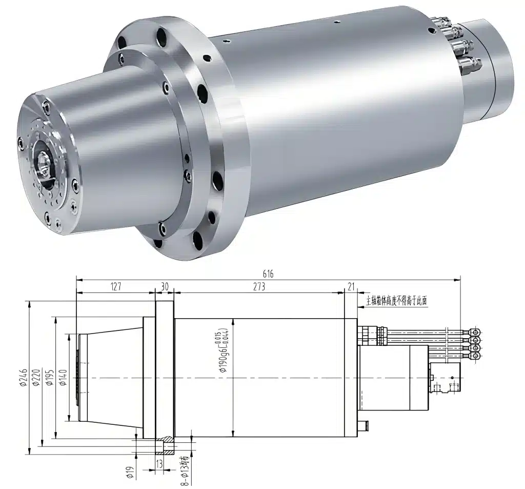 - Optimized for Swivel Head Integration: The 190mm housing with a dedicated flange and drive flat ensures secure, accurate, and repeatable mounting within AC swivel head units, maintaining tool center point (TCP) accuracy critical for 5-axis work.