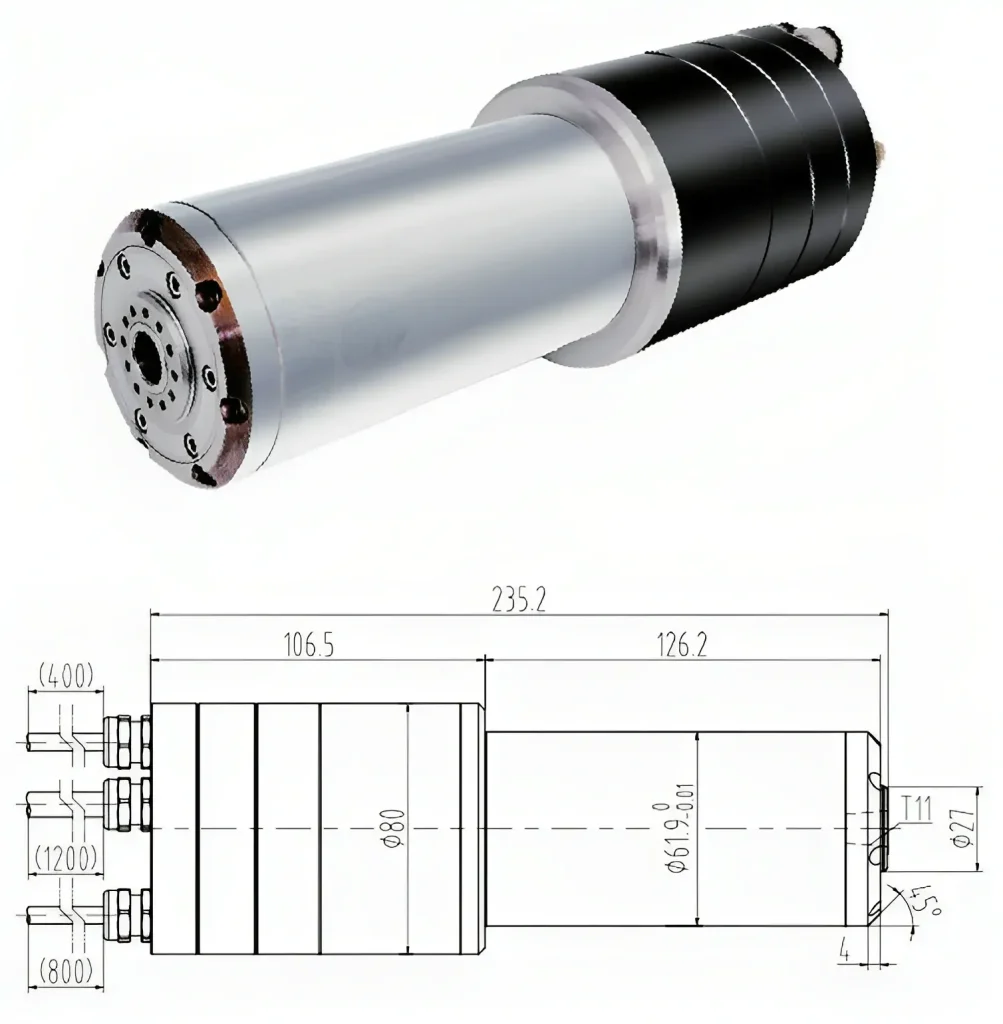 The SFG0625-62T4N is a high-performance 62mm-diameter electric spindle meticulously engineered for High-Gloss Machines (Mirror Finishing) and High-Precision Engraving & Milling Centers. Designed to achieve and maintain exceptional surface finishes, it combines a powerful 2.5KW asynchronous motor, ultra-high 60,000 rpm speed, and superior mechanical stability. This spindle delivers the precise, vibration-free performance required for flawless mirror finishes and intricate micro-machining on metals, composites, and advanced materials.
